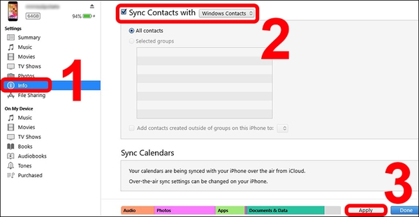 Bước 3: Chọn mục info và bật mục Sync Contacts with > Chọn Apply để quá trình đồng bộ được diễn ra.![]()