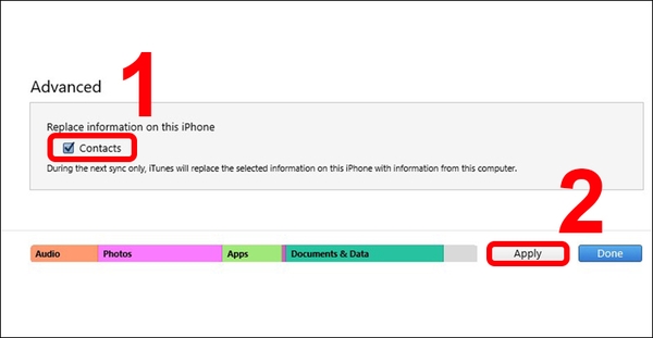 Bước 2: Kéo xuống mục Advanced và tích vào mục Contacts trong mục Replace information in this iPhone > Chọn Apply.![]()